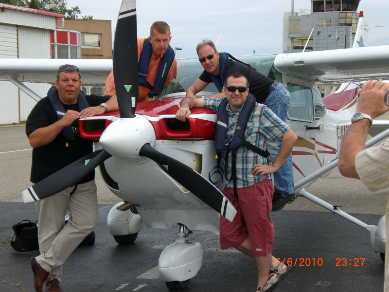 Sur place, je retrouve Yvon. Rapidement arrivent Robert, Olivier, Patrice, Nicolas et Xavier. Les sept participants à la sortie club sont désormais présents. La veille, nous avons préparé les deux appareils qui vont nous amener vers la Saint Tropez de l'Est. Patrice, Yvon, Olivier et moi même prendront le Cessna 182, Echo Bravo. Quant à Robert, Nicolas et X, c'est la PA 28 Archer III Avidyne, le Mike Sierra. L'autonomie différente des deux appareils associée à une charge utile propre à chaque machine va nous imposer de choisir deux routes différentes pour se rejoindre lors de notre première étape. La météo sur le trajet va elle aussi nous contraindre.
